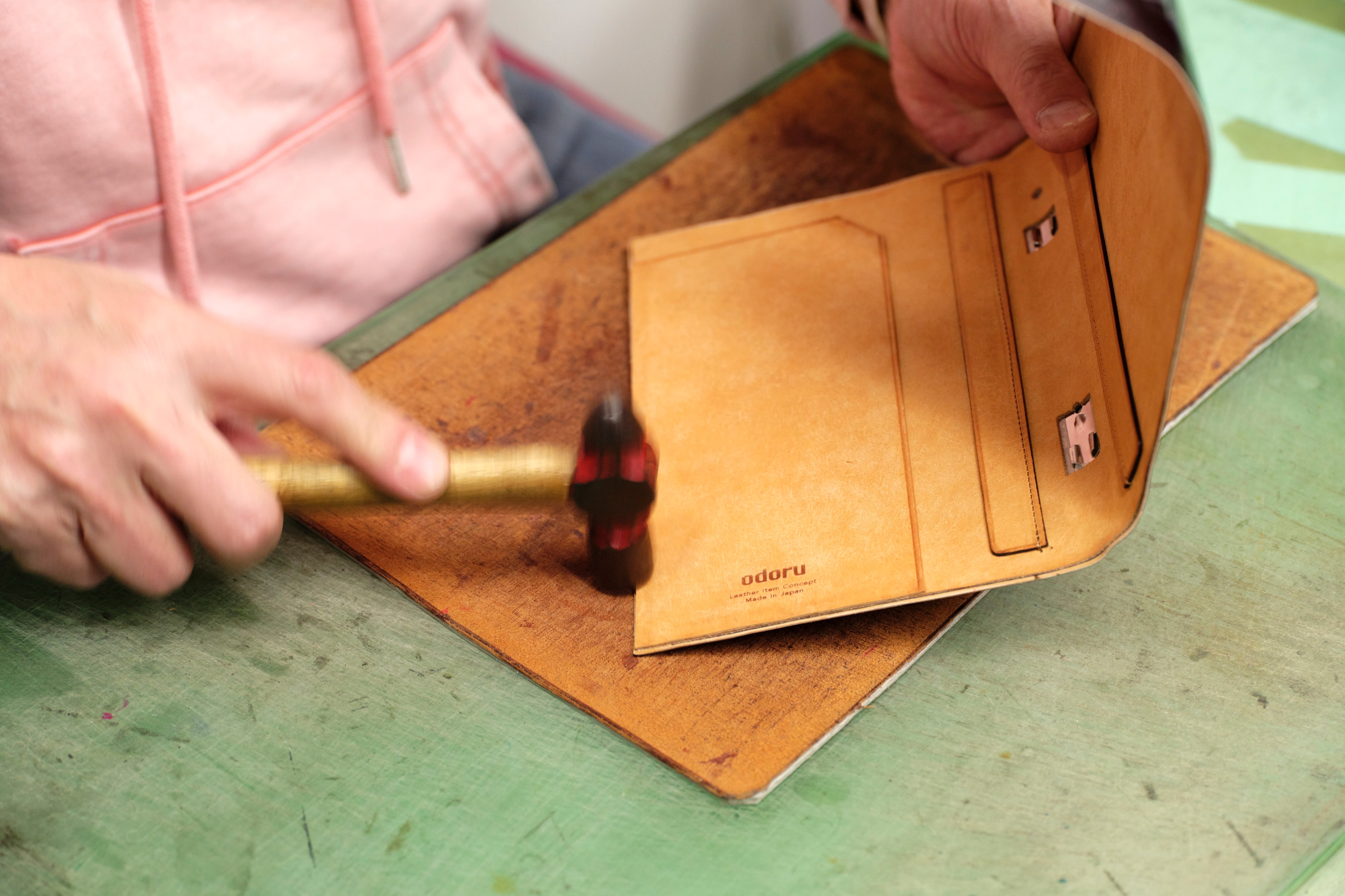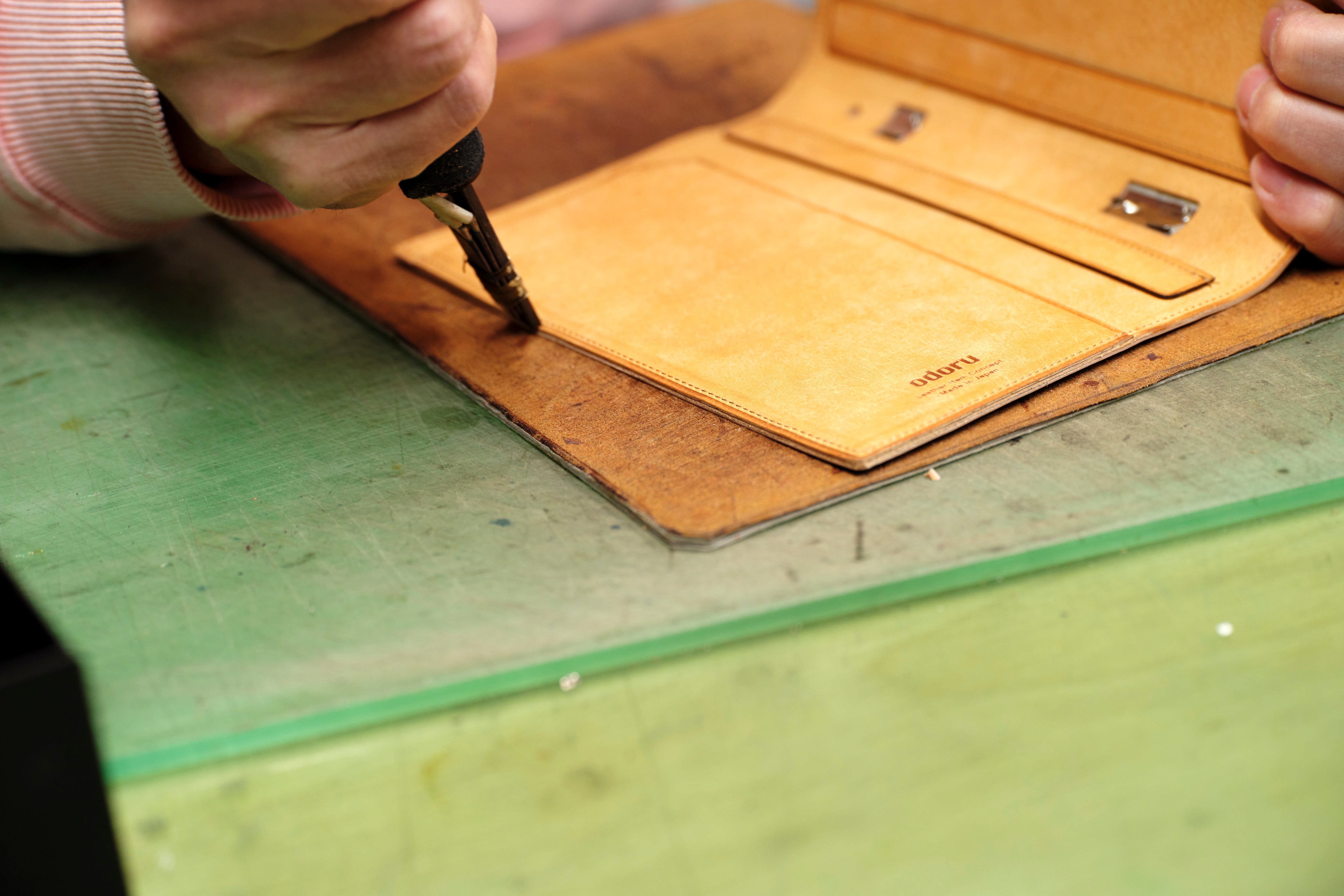 odoruの商品は、革小物を製作する家系の井戸家三代目、井戸啓晶氏が率いる職人たちが手がけます。井戸家は日本の職人技術である「切れ目」という仕上げの語源となった家系です。
