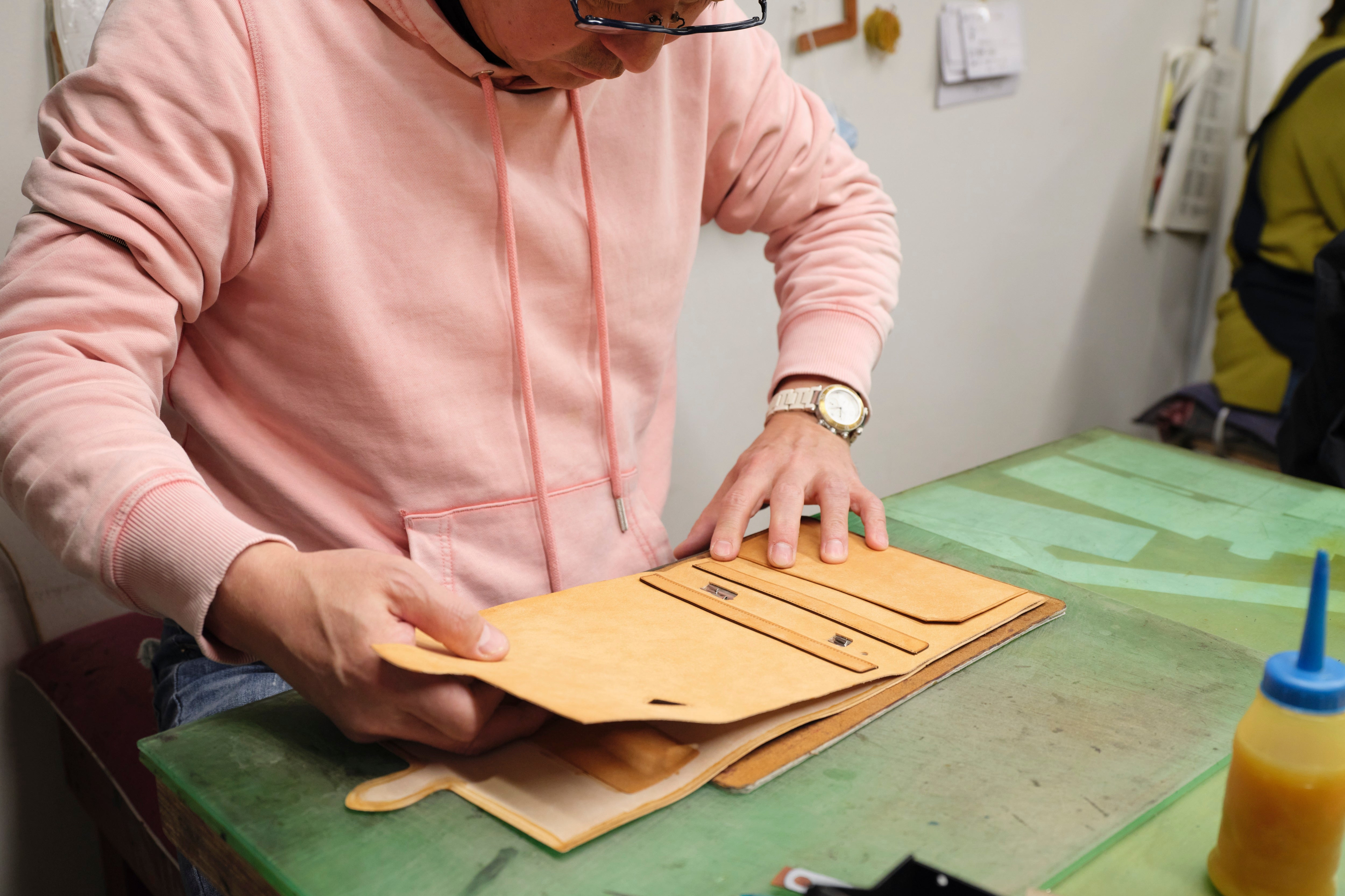 組み立ての工程では、表革と内革に紙の芯材を挟んで糊で貼り合わせます。厚くなり過ぎず、かといって強度が下がらないように調節するのがポイントです。