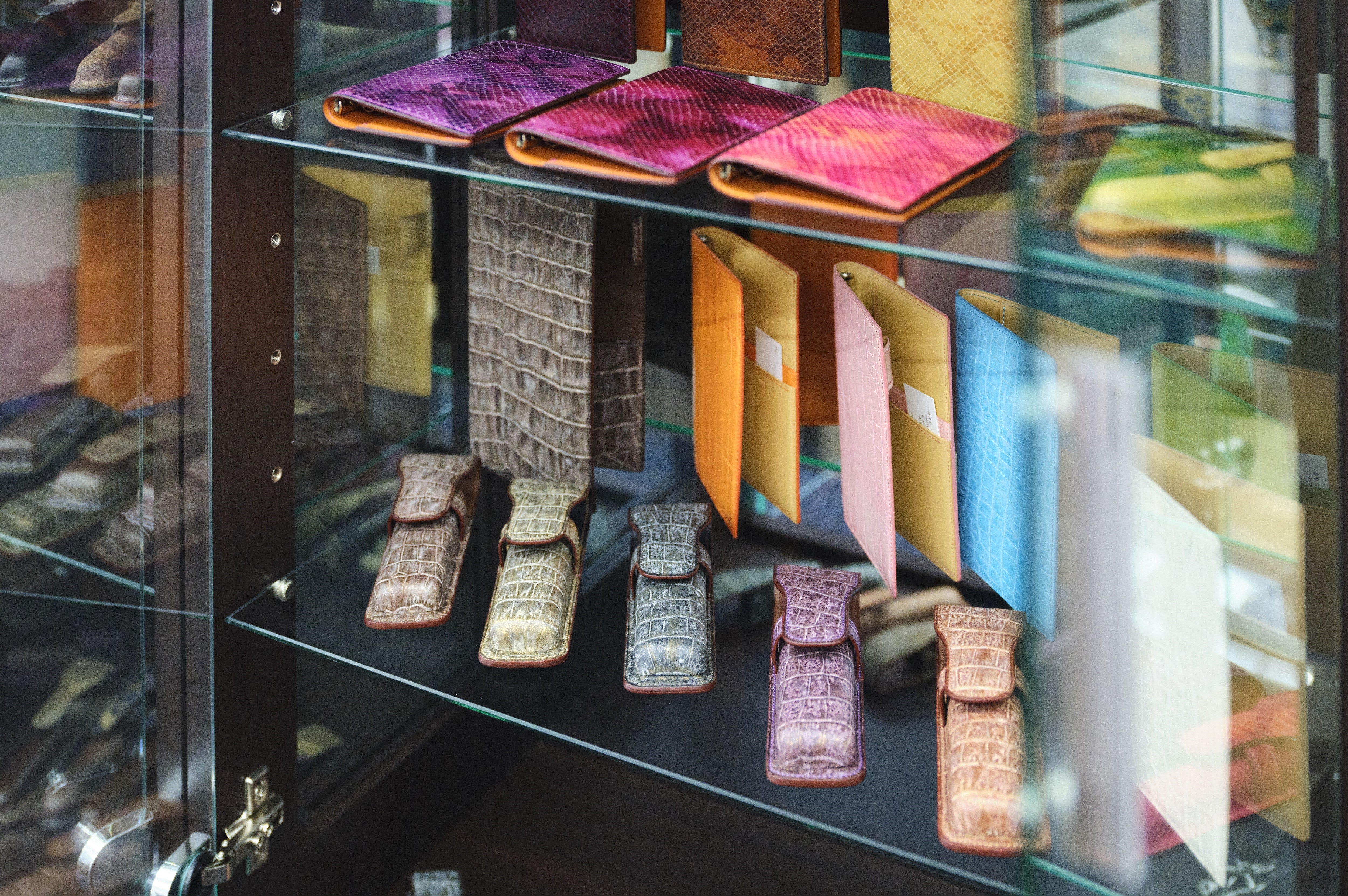 東京・日本橋に位置する店舗ではオドル製品はもちろん、故井戸辰夫氏が手がけた一点物の革小物も販売しています。コードバンや牛革だけでなく、クロコダイルやエレファント、ウミガメ、バッファローなどの製品をラインアップし、レザーファンのための至極の空間を提供いたします。